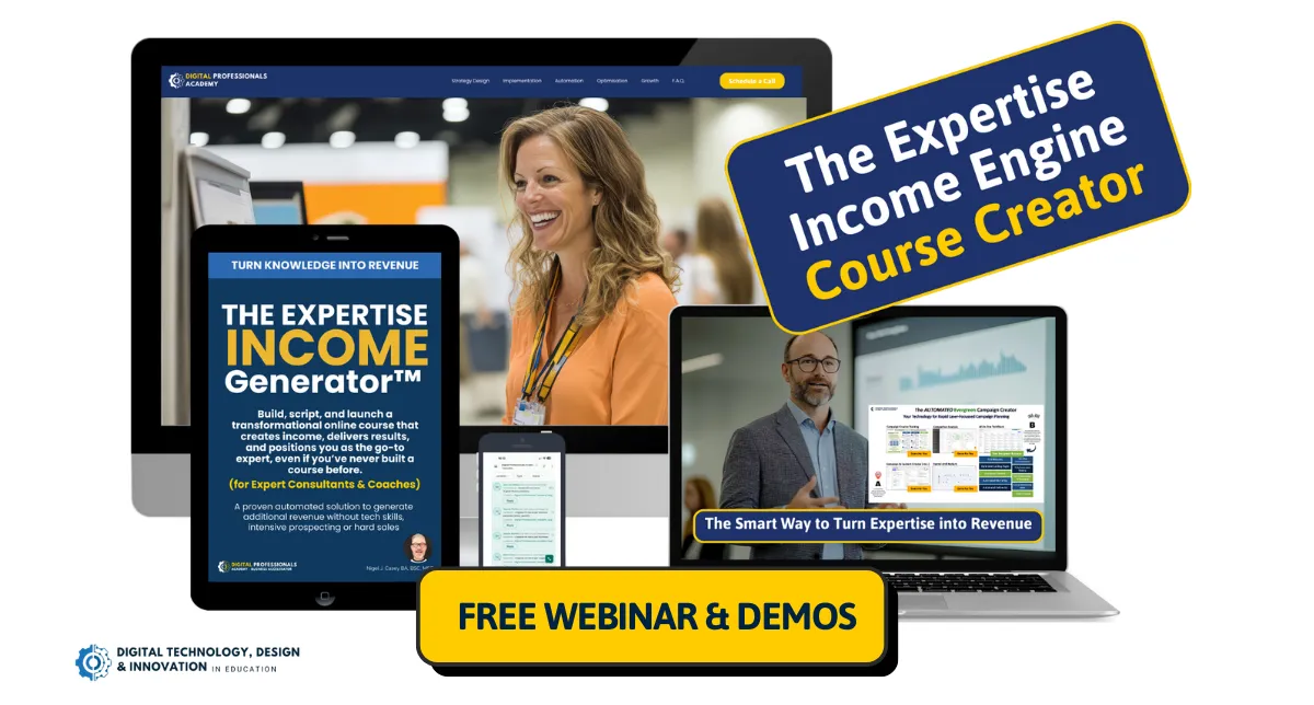 Hi, I’m Nigel Casey, founder of Digital Professionals Academy and creator of the Expertise Income Engine. I help experienced professionals, consultants and coaches turn their expertise into serious online courses that also work as client acquisition systems, supported by a private team of 14 custom AI specialists, just for your business.